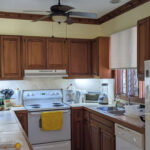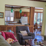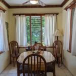 The kitchen has a good area for preparing meals and the dining room has its own charming space with windows around it for viewing the lush green outdoors.