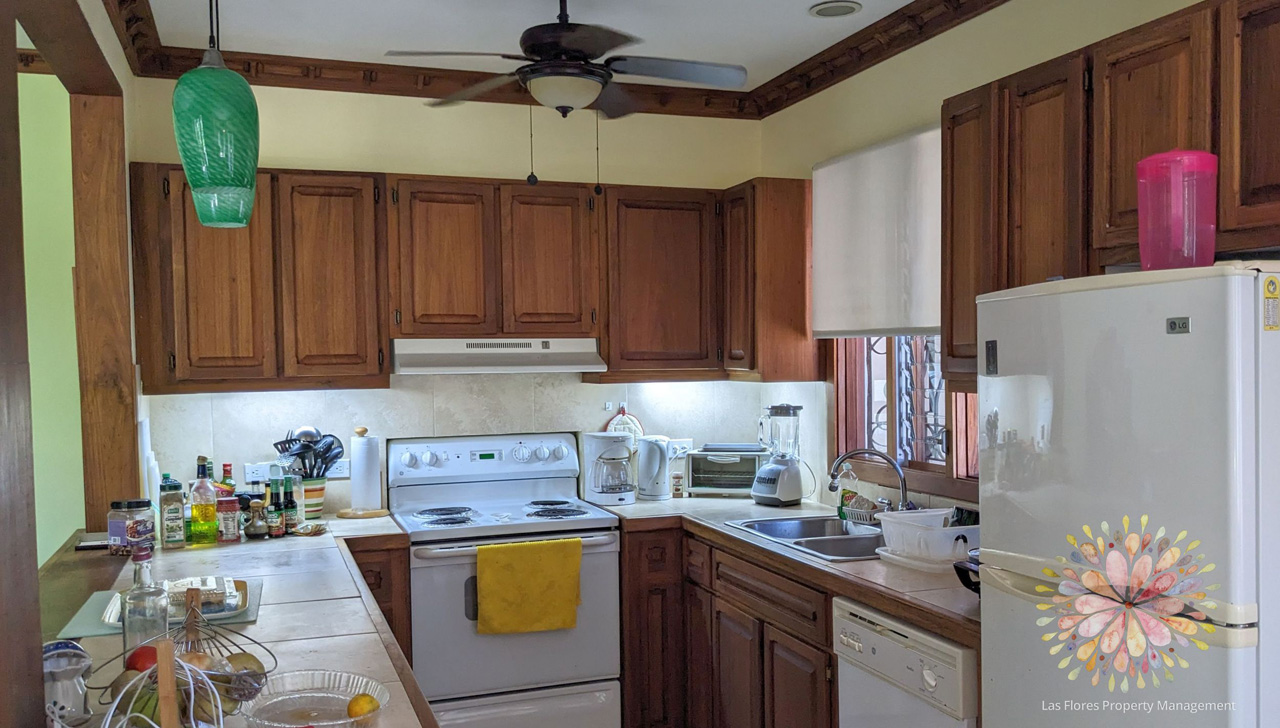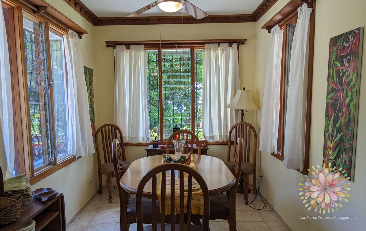 The kitchen has a good area for preparing meals and the dining room has its own charming space with windows around it for viewing the lush green outdoors.